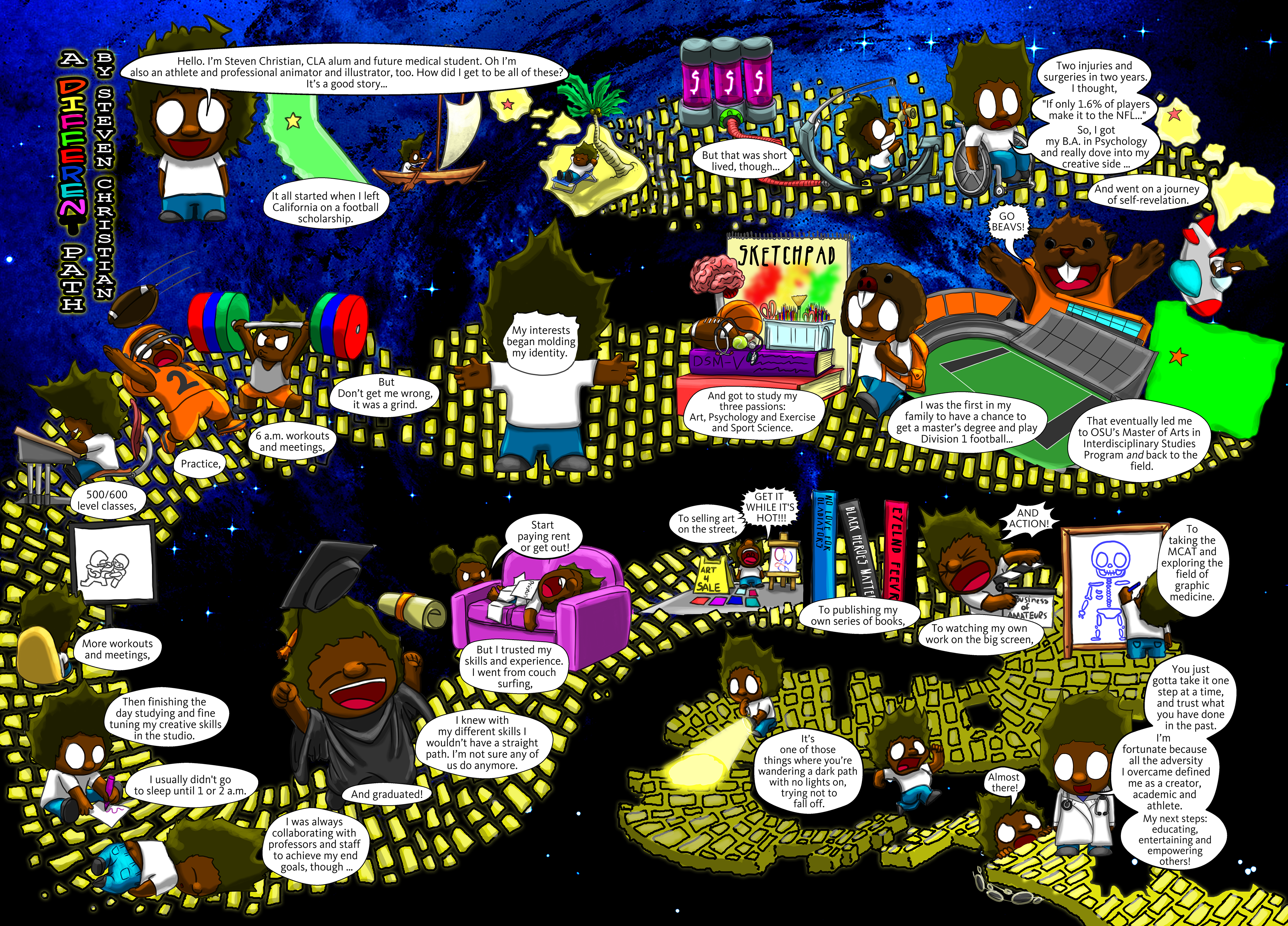 I was fortunate enough to work with my old Alma Mater to tell my creative journey at Oregon State. They asked me to make a comic spread for their University Publication.